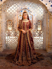 The meticulously selected unique shade of scarlet is the bridal color of the season. The voluminous straight shirt that has a wide heavily embellished daaman comes with high slits and ultimately makes it the most flattering silhouette for a bride. The pure cotton net shirt is beautifully embellished with intricate gold zardozi, dabka, sequins, and silver zari, naqshi, gota. Heavy on the traditional mukesh and kamdani this look is truly the one that will stand out this season. It has a heavy floral trellis on the front and back which gives the bride regal feels. This elegant shirt is complemented with a farshi lengha made in gold jamawar with heavily worked shades of royal pure raw silk for the goth.