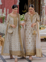 An ethereal ivory tulle pishwas featuring a double-layered flare, intricately hand-worked with dabka, zardozi, and hand-cut sitara. Every inch of this ensemble is crafted with meticulous care, reflecting the love, dedication, and countless hours of craftsmanship poured into its creation. A timeless masterpiece for those who value traditional artistry.