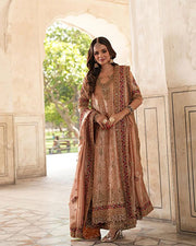 Heavily crafted in age-old techniques, this crimson long cotton net shirt features signature bird and floral motifs & bead detailing. Paired with a chai pink brocade lehnga with floral motifs and gold tissue finishing. A rose gold heavily worked tissue Dupatta ties the ensemble together in harmony