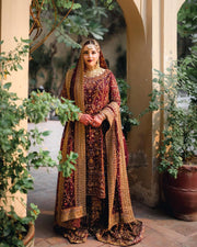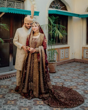 Introducing latest bridal arrival from Haris Shakeel ā a timeless masterpiece in deep maroon, richly adorned with intricate gold embellishments and traditional craftsmanship. This regal ensemble captures the essence of old-world charm blended with contemporary finesse, making it a perfect choice for brides who want to embrace heritage while looking effortlessly graceful. From the luxurious fabric to the exquisite handwork, every detail speaks of eleganceĀ andĀ royalty.