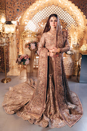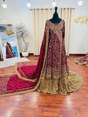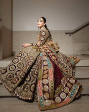 Step into timeless elegance with this exquisite bridal ensemble by Zeeshan Danish, rendered in rich tones of maroon and rust gold. This masterpiece features a heavily hand-embellished front-open gown layered over a classic farshi lehenga, showcasing detailed zardozi, naqshi, and sequin work throughout. The delicate balance of traditional craftsmanship and modern silhouette makes it ideal for a bride seeking both heritage and style. Paired with a soft net dupatta adorned with scalloped edges and intricate motifs, this dress captures the essence of bridal grandeur with a graceful, flowing charm that turnsĀ everyĀ head.