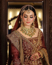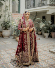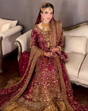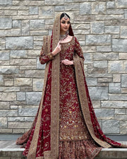 A carefully chosen shade of deep berry red is adorned with stunning gold handwork. The silhouette of the outfit with high slits makes it the ultimate flattering silhouette. The net shirt is embellished with intricate zardozi, dabka, sequins gold and silver zari, naqshi, gota and mukesh. It has a heavy floral trellis on the front and back which gives the bride regal feels. This elegant shirt is complemented with a farshi lengha made in jamawar with applique on the lehnga.