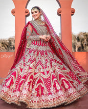 The meticulously selected unique shade of scarlet is the bridal color of the season. The voluminous straight shirt that has a wide heavily embellished daaman comes with high slits and ultimately makes it the most flattering silhouette for a bride. The pure cotton net shirt is beautifully embellished with intricate gold zardozi, dabka, sequins, and silver zari, naqshi, gota. Heavy on the traditional mukesh and kamdani this look is truly the one that will stand out this season. It has a heavy floral trellis on the front and back which gives the bride regal feels. This elegant shirt is complemented with a farshi lengha made in gold jamawar with heavily worked shades of royal pure raw silk for the goth.