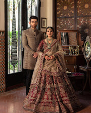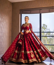 A painstakingly chosen shade of the richest scarlett. The pure cotton net shirt with full sleeves is adorned with exquisite hand embroidery. Traditional embellishments such as intricate kora, dabka, naqshi and kaamdaani. Rust and coral appliqued borders decorate the daaman. The timeless shirt is complemented with a scarlett, farshi lengha cut from pure banarsi jamawar hand embroidered with floral panels and peacock motifs. The pure cotton net dupatta is embroidered with star burst sequins and kaamdaani detailing. The pallus of the dupatta are decorated with rust and coral applique.