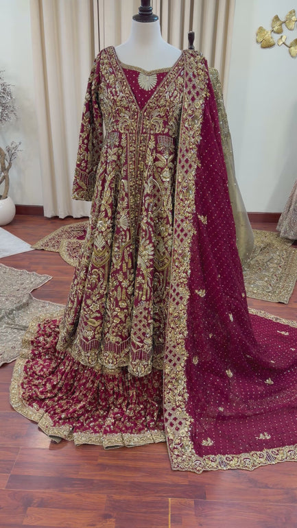 Latest 2026 Article Ahmad Sultan. Unveiling the epitome of bridal magnificence by Ahmad Sultan a breathtaking creation in deep crimson, brought to life with intricate hand embellishments, rich zardozi, and regal craftsmanship. This masterpiece exudes timeless elegance and embodies the spirit of a traditional Eastern bride, reimagined with modern luxury. Every detail, from the sweeping trail to the delicately adorned dupatta, is designed to captivate.
