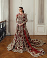 Amarilla is a stunning gown with a jewel neckline, complemented by a veil and a finely scalloped dupatta. Adorned with Naqshi, kora, dabka, multi-crystal, and Swarovski, the gown showcases elaborate beadwork and resham. The Mukaish spray and scallop hem add a touch of regal sophistication.