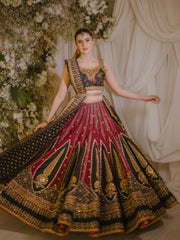 Dark and dramatic as a broody ghazal, Dil Ras in black Indian silk features a full-sleeved choli that is dotted with a constellation of miniature motifs embroidered in metallic and silken threads, making it a starry sky of its own. The lehenga begins in deep maroon panels that gently bleed into black, layered with printed and embroidered cypress trees and Levantine palmettes that rise like architectural sentinels. Each motif is carefully block printed and hand-embellished with glittering mirrorwork, sequins, and golden thread. The hemline is circled with rich maroon and gold borders, stacked and layered like antique inlay on a treasure chest. The organza dupatta carries maroon and gold floral sprays across its breadth, shimmering with gota pati and adda work, edged with embroidered trims on all four sides.
