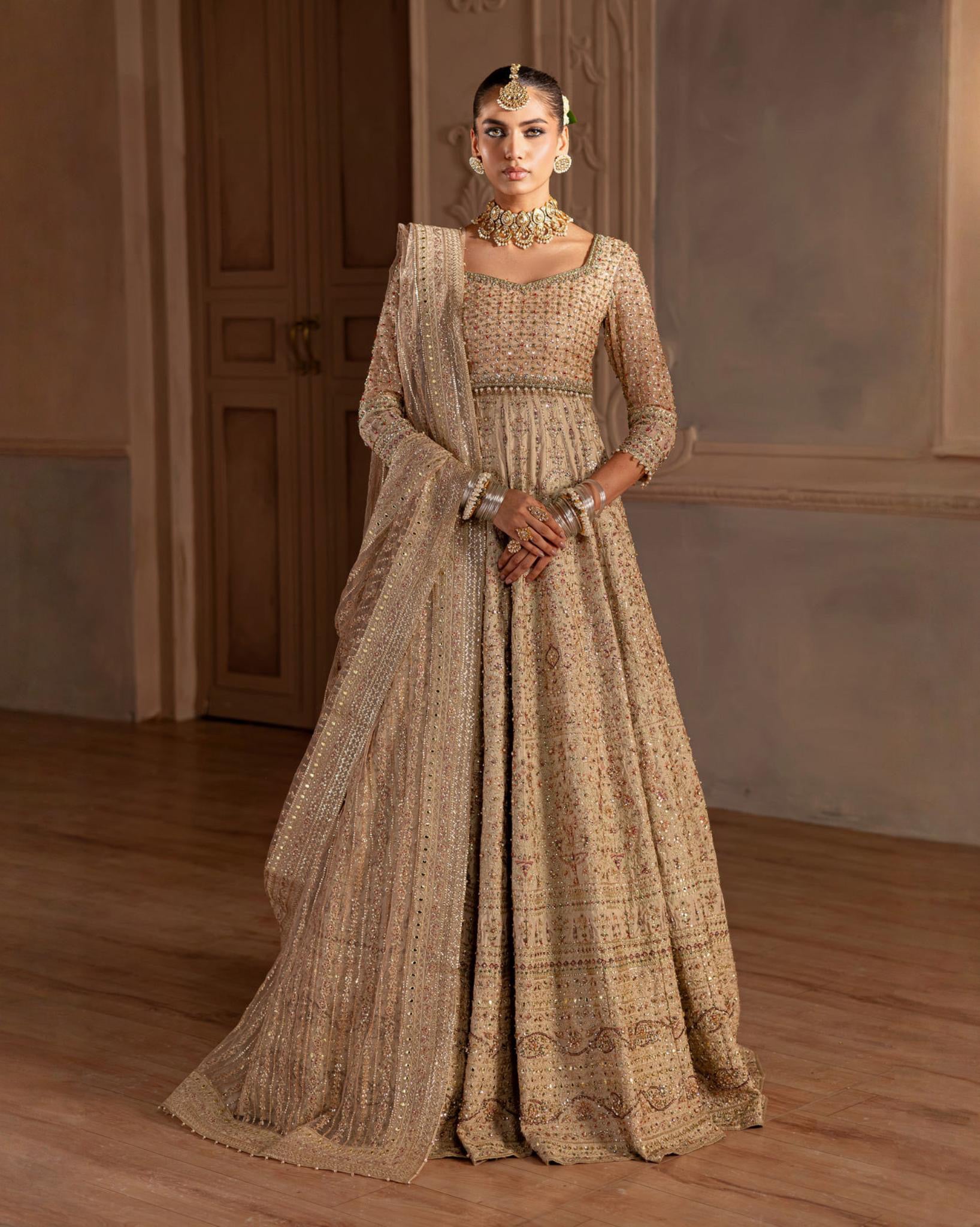 Introducing latest bridal arrival from Haris Shakeel, a timeless masterpiece in this stunning nude-gold French lame bridal, beautifully paired with a delicate French net candy pink dupatta. A perfect blend of luxury and grace for your big day!