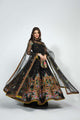 This elegant black net anarkali showcases exquisite multi-sequence and tilla booties on the upper side, alongside rich resham and multi-sequence floral embroidered panels. The ensemble is perfected with a detailed black velvet embroidered border and touches of mehendi green taffeta. Intricate zardozi work graces the neckline and shoulder top motifs. Paired with flared PK silk pants adorned with a velvet embroidered border, the outfit is complemented by a net dupatta featuring multi-sequence and resham borders, highlighted by a captivating jaal finished with velvet and bordered accents