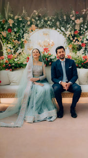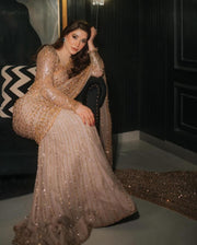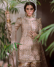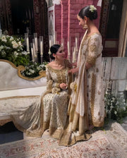 Tehreem wears Kamila, a pure silk kameez in GOLD is filled with a generous spray of dabka, sheesha and tilla. The shirt is brought together with our signature hand made doris worn with a kaccha tilla gharara and a net dupatta with hand embroidered borders.