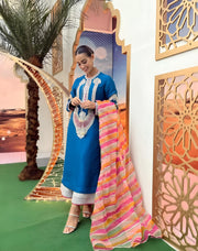 A stunning teal blue raw silk long shirt with tassels and beautiful embellishments in the front of the shirt and on the sleeves. The embellishments include delicate work of nakshi, dabka, sitara and cutdana in the hues of pink, orange, dark green, olive green, silver and iceblue. It comes along with a culotte pant which has pockets on the sides and a fine border of sequins and thread in pink and orange. The outfit consists of a flowy chatta patti organza dupatta in multicolor and gotta finishing