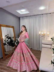 This dazzling pink ensemble, crafted from luxurious tissue fabric, features intricate thread and tilla embroidery, shimmering sequin work, and delicate panni embellishments
