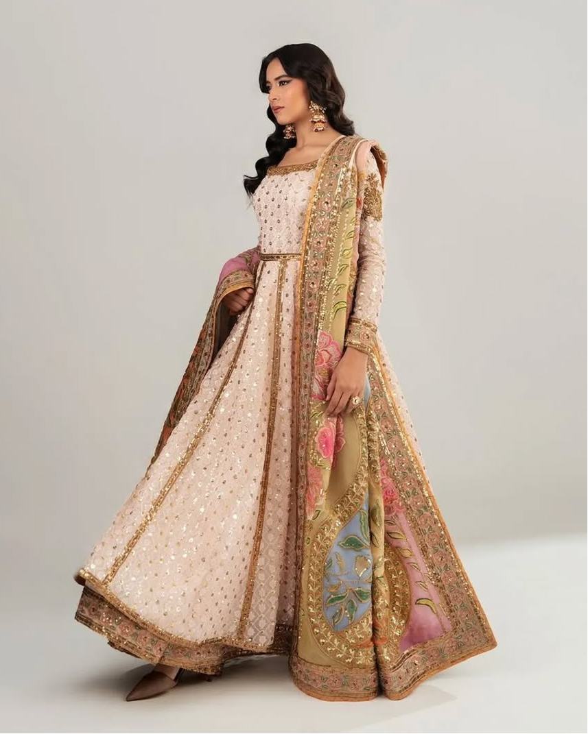 This stunning organza anarkali ensemble, elegantly lined with premium PK silk, is beautifully complemented by an exquisite shawl crafted from a blend of floral embroidery and intricate embellishments. The delicate sequined details intertwine seamlessly with the floral motifs, creating a captivating look that exudes sophistication and charm..