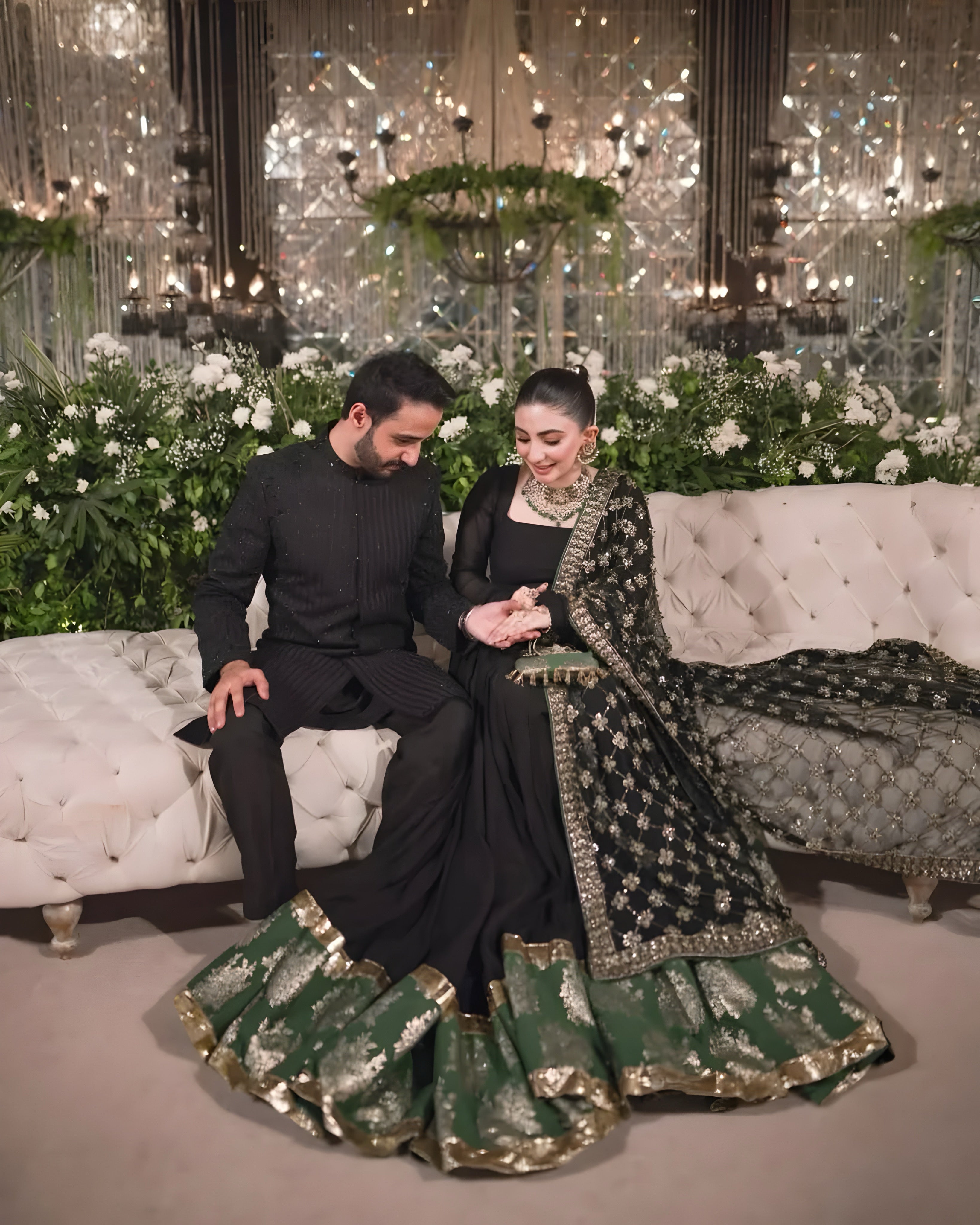 Minal Khan truly stole the spotlight in this breathtaking lame golden and mint green angharaka by Haris Shakeel, beautifully accentuated with rich red hues. The intricate detailing, graceful silhouette, and vibrant contrast of colors made this ensemble a true showstopper. Radiating elegance, tradition, and modern sophistication — she carried the look with absolute perfection, turning every head along the way