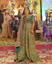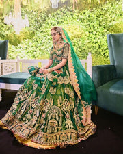 An enchanting deep emerald green bridal lehenga choli adorned with intricate gold zardozi, resham, and gota work, perfectly paired with a heavily embellished mauve dupatta. The flared silhouette and regal detailing make this ensemble a timeless choice for mehndi or shendi brides who wish to make a grand statement