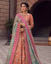 Shafaq is a our signature tangerine hued peshawas bridal ensemble featuring Scrolls of floral vines and vegetal branches creep up along the hemline of the skirt with glistening resham embroidery, beadwork and crystal adornments. It is paired with duo of dupatas, one in contrasting light turquoise blue featuring decadent embroidery and a festive pink border and kiran finishings.The other in coordinated tangerine equally resplendently embellished has demure coral pink border along the sides and also has kiran fringe trims