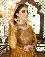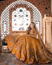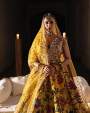 Mehndi Bridal is a beautiful two toned mustard bridal lehnga choli crafted on a raw silk base. It is heavily hand embellished and composed with our signature jewel motifs with stone work, gotta, dabka and crystals. It comes with a heavy jaal dupatta with accents of pearl and gotta and framed with a hand rendered border. It is paired with a digitally printed zari organza dupatta finished with kiran