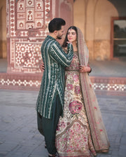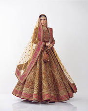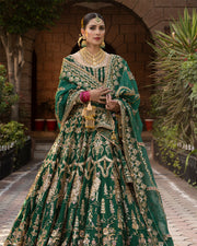 Nazneen is our luxurious emerald green and gold bridal ensemble that takes inspiration from the rich heritage of Mughal frescos dotted all across Punjab, the skirt features graduating motifs of floral vases and sprigs of blossoms in dazzling metallic threadwork sitting on lush bed of emerald green. It is paired with duo of dupattas one of them coordinated green dupatta resplendently embellished with architectural motifs and the other a diaphanous one in contrasting rose pink makes for an exquisite look
