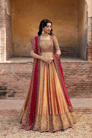 Radiate warmth with Bano Begum in marigold orange from the Gold Series Hussan Ara Mansion Collection by Mohsin Naveed Ranjha. The choli, crafted from Italian silk fabric and adorned with opulent multihead embroidery, golden trims, sequins, and heavy adda work, is a celebration of luxurious craftsmanship. Paired with a Lehenga featuring decorative roundels encasing floral motifs and intricate multihead embroidery on luxe silk jamawar, it's a vision of elegance. Delight in two divine dupattas: