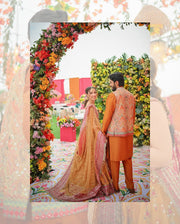 One of our personal favorites, the ultimate Shendi bridal. Burnt orange paired with a deep fuchsia, the gota accentuates the inherent sheen of the fabric.