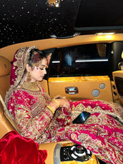 Rich, royal, and timeless, this deep maroon velvet bridal lehenga is the epitome of traditional grandeur from Mohsin Naveed Ranjha. Heavily hand-embellished with antique dabka, zardozi, and resham detailing, the lehenga features grand floral motifs and signature old-school patterns reminiscent of MNR’s classic heritage style. The choli is adorned with fine embroidery, crystal hints, and structured sleeves, while the dupatta adds grace with detailed borders and handmade tassels. A perfect choice for barat brides looking to channel royalty on their big day