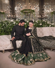 Magnificently crafted plain black chanderi silk floor length peshwaz beautifully finished with emerald green chanderi silk border that has been enhanced with gotta Patti. It has been paired with black chanderi silk chooridar to create an elegant ensemble. To complement this eye turner look it comes with a black net dupatta that has exquisite border enhanced with opulent adda work of gold sequins, naqshi and muqash. Further highlighting the intricacy with green cutdana and finishing borders with green chanderi silk facing.