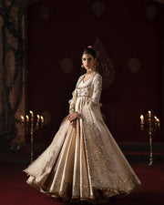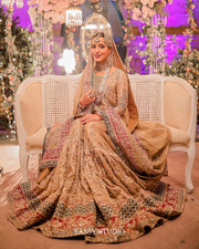 Ethereal elegance for a Nikkah look A timeless Sade Bin Shahzad opulent gold chanderi net tissue double-layered pishwas, adorned with intricate embroidery and delicate handwork details that exude timeless elegance. Paired with a regal jamawar lehnga and a graceful chanderi net dupatta, this ensemble is a perfect blend of tradition and luxury.