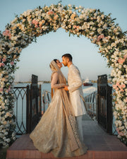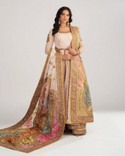 An ethereal ivory tulle pishwas featuring a double-layered flare, intricately hand-worked with dabka, zardozi, and hand-cut sitara. Every inch of this ensemble is crafted with meticulous care, reflecting the love, dedication, and countless hours of craftsmanship poured into its creation. A timeless masterpiece for those who value traditional artistry.