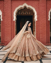 A dreamy peach-pink bridal set, masterfully handcrafted with intricate dabka, resham, tilla, and other traditional techniques. This ensemble reflects timeless elegance and regal charm—perfect for a classic bridal look