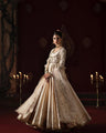 A timeless flairy pishwas in a soft pinkish white hue, adorned with delicate handwork on the bodice that adds regal charm. Paired with an intricately embellished organza dupatta, this ensemble flows with grace and sophistication perfect for an ethereal bridal or festive statement.