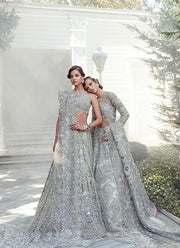 The exquisitely decorated Aysana accentuates the brilliance of contemporary design elements. Silver and gold hand works are laid out intricately on this generously flared silhouette which features an elaborate floor sweeping back trail. Its artwork is a unification of Victorian vintage frames and Mughal inlay work wrought attentively using pearls, sequins, naqshi and stones. Paired with a gorgeously hand detailed dupatta, Aysana blossoms with femininity and grace.