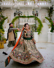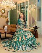 Celebrate your mehndi in timeless elegance with this signature green bridal ensemble by Noman & Bhaiya. Crafted in a rich mehndi green tone, this outfit beautifully blends cultural heritage with contemporary finesse. The shirt/peshwas is adorned with intricate gota, tilla, mirror work, and dabka embroidery — brought to life through hand embellishments that sparkle with every movement.