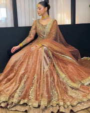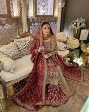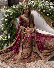 A vision in maroon and gold, this masterpiece from Faiza Saqlain’s latest bridal collection is pure royal opulence. With its heavily embellished front-open shirt, intricately handworked lehenga, and a statement dupatta adorned in signature tilla, resham, and zardozi work — this ensemble is the ultimate pick for the modern-day bride who desires timeless elegance on her big day. From every thread to every motif, this outfit narrates a tale of craftsmanship and grandeur that leaves a lasting impression. Perfect for your Barat day — where tradition meets regal charm.