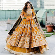 A vibrant yellow mehndi outfit by Mohsin Naveed Ranjha, this dress perfectly captures the joyful spirit of pre-wedding festivities. The shirt is adorned with traditional gota, tilla, mirror work, and resham embroidery, reflecting the classic MNR aesthetic — rich, detailed, and timeless.