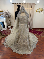 Step into timeless elegance with Ahmad Sultan’s latest masterpiece in ice blue. This stunning new arrival is the ultimate Walima look—delicately adorned with intricate embellishments, dreamy details, and a regal flow that makes every step feel magical. Perfect for brides who want sophistication, sparkle, and unforgettable grace on their big day