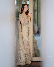 Introducing latest bridal arrival from Haris Shakeel, a timeless masterpiece in this stunning nude-gold French lame bridal, beautifully paired with a delicate French net candy pink dupatta. A perfect blend of luxury and grace for your big day!