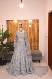 A masterpiece inspired by the soft, ethereal hues of moonlit streams, captured in an enchanting shade of frost blue. This bridal gown features a full mermaid silhouette, seamlessly contouring before cascading into a trail. Its delicate, hand-embroidered floral motifs drift gracefully across the gown. Each blossom is intricately adorned, evoking the serenity of morning dew on petals under the first light. A dip-dyed layer of frost blue tissue under tulle radiates a luminous glow, enhanced by a meticulous array of silver zardozi, cut dana, and crystal beads. A trailing tulle veil completes the look, embellished with a delicate scatter of crystals, creating the illusion of dewdrops shimmering on blooms. The romance of nature and the beauty of bridal couture unite, offering a breathtaking vision of love under the soft hues of dawn.