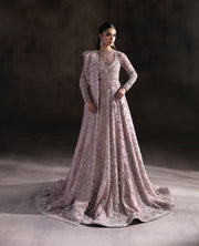 Novella is a V neckline gown, fully fitted and adorned with running floral compositions, leaves, petals, and branches. The gown features geometric details and organza pastels, enriched with tulle details, bethki, mukaish, and ribbon work. Intricate naqshi, kora, dabka, resham tilla work, Swarovski sequins, and cutdana add to its timeless elegance.