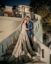 Zephyrs presents a gown with a jewel neckline and a perfectly cut triangle, paired with a scalloped dupatta. The gown is adorned with Swarovski, multi-crystal, colorful cutdana, and organza leaves, offering a delicate pastel palette. Naqshi, kora, and dabka embroidery enhance its ethereal charm