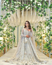 Azalea’s gown features a V neckline, optional front open details, and a fully fitted belt. The arches and round floral compositions are enhanced with mirror work and geometric details. The gown is adorned with bethki, mukaish, ribbon work, naqshi, kora, dabka, and Swarovski sequins, reflecting a perfect blend of tradition and modernity.
