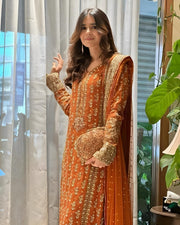 Zeeshan Danish Elegant, traditional and decidedly contemporary, Bride looks regal in this anari red kalidar pishwas that open from the front to manifest a farshi sharara in hues of saffron and deep red