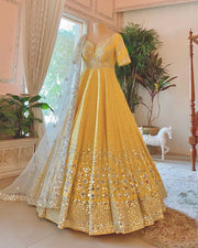 An ode to the Mughals’ love for the summer gardens, Najmeh features a composition of floral patterns bordered by laurel leaves in playful hues, while the lehenga is uplifted by a sophisticated layering of techniques of tilla, naqshi, gota and resham. This ensemble is paired with an embellished net dupatta. Rooted in vintage glamour, Najmeh is the ultimate in festive luxury.