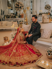 The meticulously selected unique shade of scarlet is the bridal color of the season. The voluminous straight shirt that has a wide heavily embellished daaman comes with high slits and ultimately makes it the most flattering silhouette for a bride. The pure cotton net shirt is beautifully embellished with intricate gold zardozi, dabka, sequins, and silver zari, naqshi, gota. Heavy on the traditional mukesh and kamdani this look is truly the one that will stand out this season. It has a heavy floral trellis on the front and back which gives the bride regal feels. This elegant shirt is complemented with a farshi lengha made in gold jamawar with heavily worked shades of royal pure raw silk for the goth.